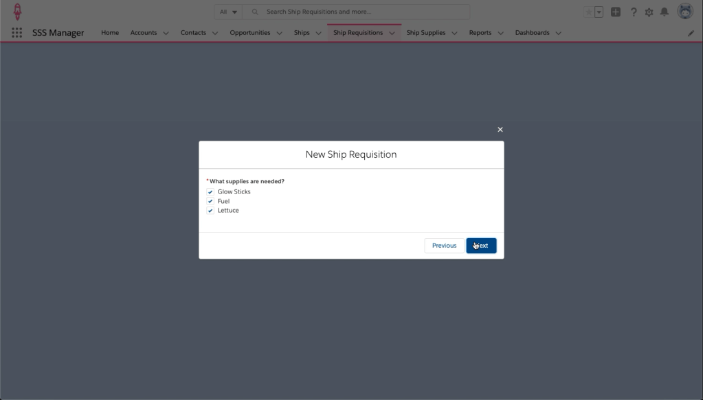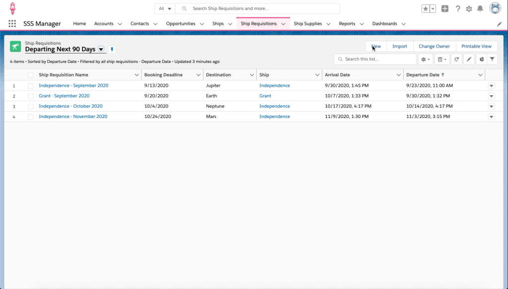 Now that Tim has done the configuration work (in his sandbox, like the Awesome Admin he is), he tests out his work by clicking New on the Ship Requisitions tab.