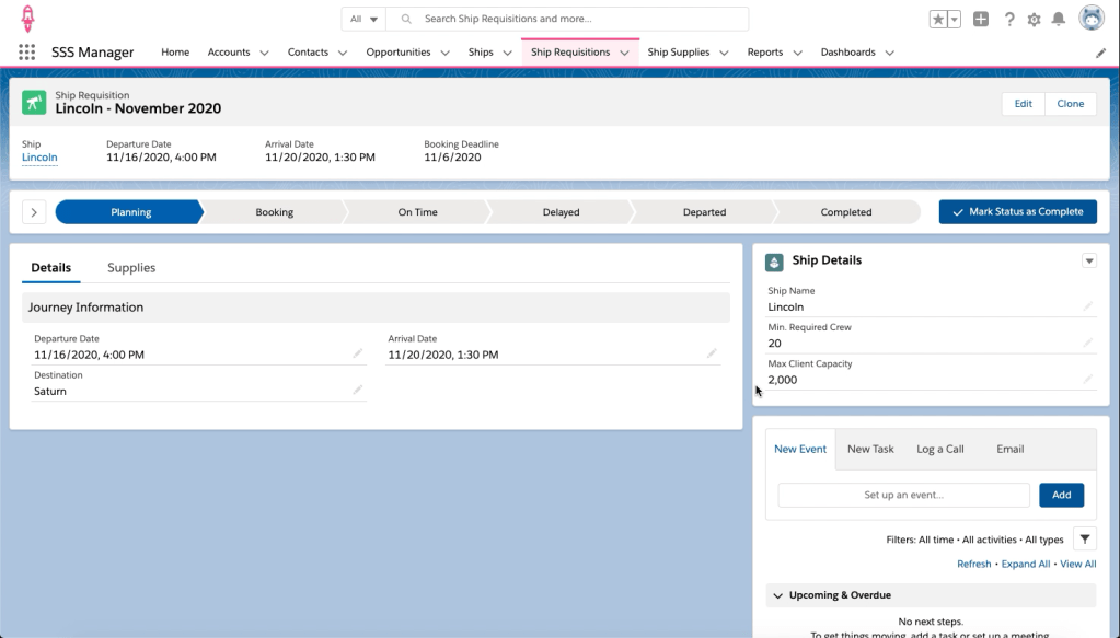 Let’s pretend Tim McGee is an awesome admin at Skywalker Space Shuttles. Tim’s VP of Operations, Becky Stark, comes to Tim and tells him she’s seen a lot of Ship Requisitions created without the necessary Supplies Needed records. She asks Tim to find a way to make sure this doesn’t happen. Tim thinks about the best way to solve this. He knows his users prefer to do a minimal amount of clicking and thinks Flow will be a good option.
