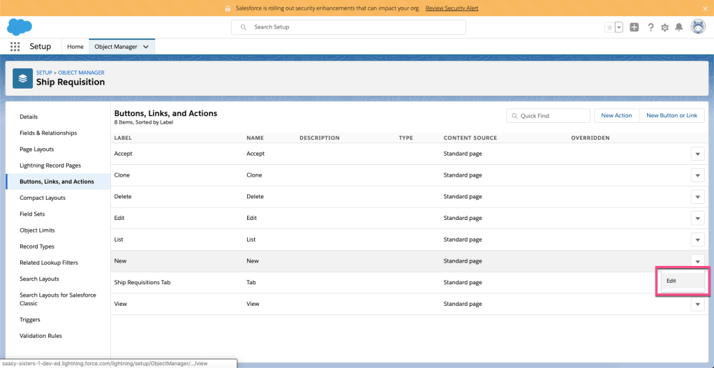 Once Tim has deployed the component to his Sandbox, he can override the “New” button with it. First, he goes to the Ship Requisition object in the Object Manager. Then he selects Buttons, Links, and Actions. Next to the New button, he clicks the drop down arrow and selects Edit.