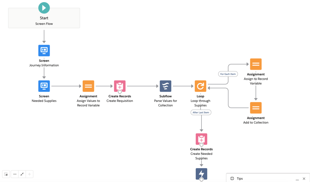 First, Tim creates a Screen Flow to enter the required information for both the parent and child records.